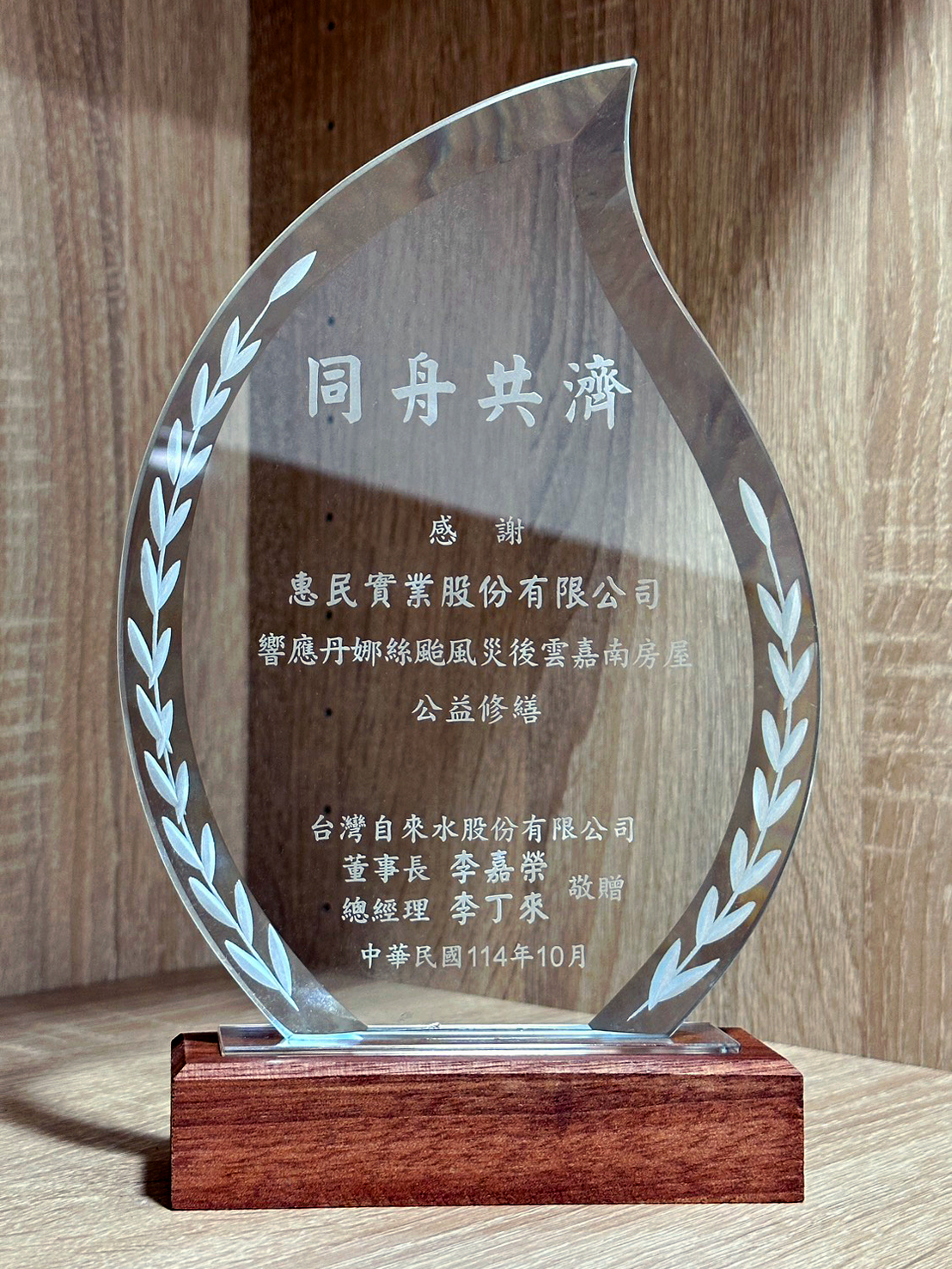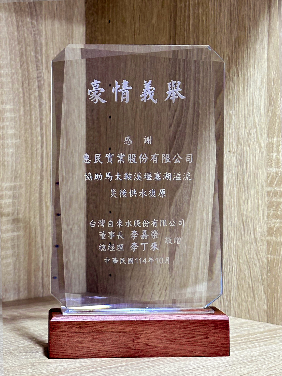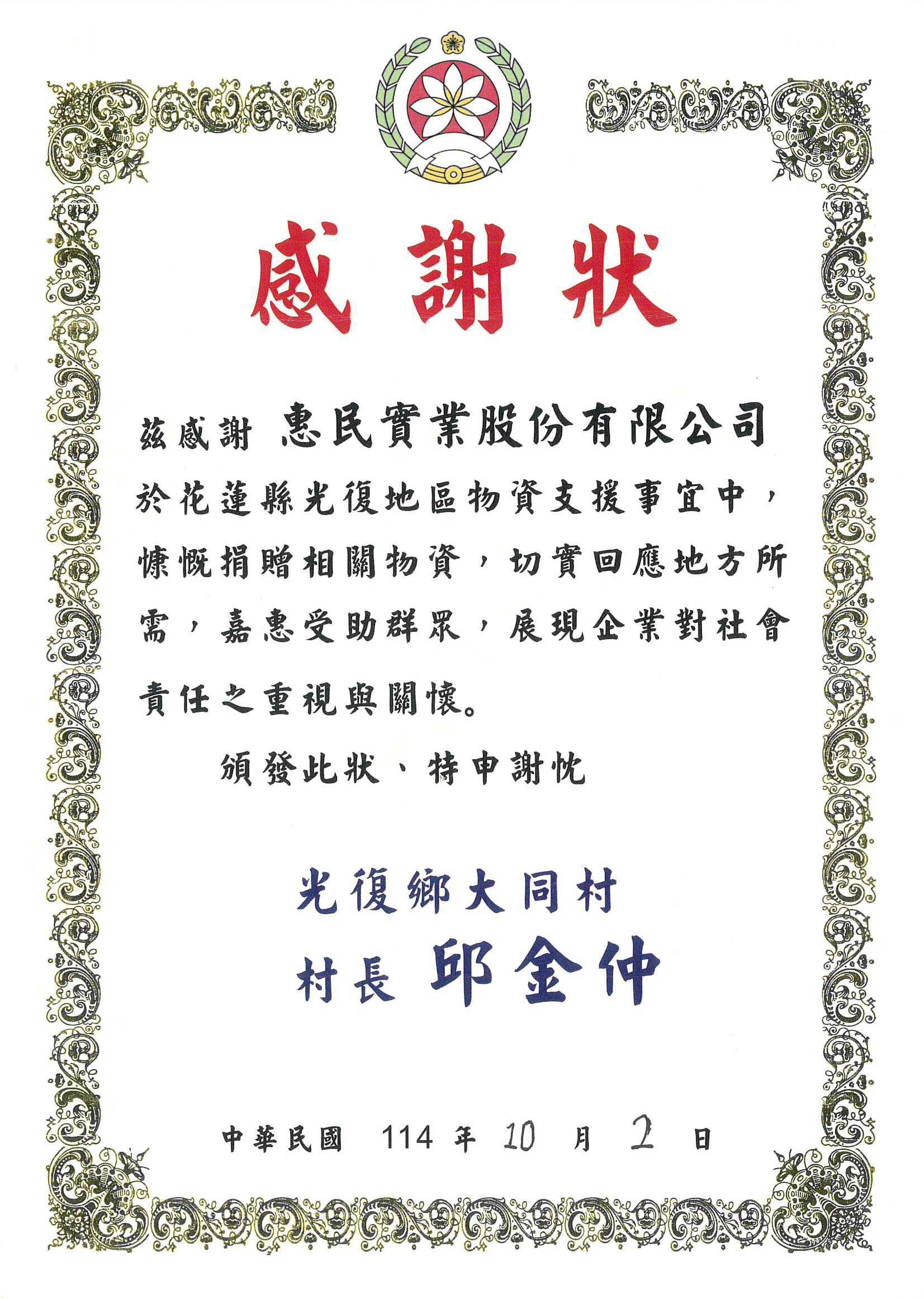 惠民實業積極履行社會責任、關懷在地社會 News 2025-10-28 2025年9月花蓮縣馬太鞍堰塞湖溢災情,除光復救災關懷團至現場清淤及修復自來水管線,為協助受災居民度過難關,本公司主動捐贈民生物資前往花蓮光復地區,投入復原及重建行動。 此次行動展現了企業積極履行社會責任、關懷在地社會的精神。感謝光復鄉大同村及台灣自來水股份有限公司對本公司善舉的肯定,特頒發感謝獎狀、獎盃以表謝意。 本公司將持續以實際行動支持地方,與社會各界攜手共度難關,傳遞溫暖與希望。