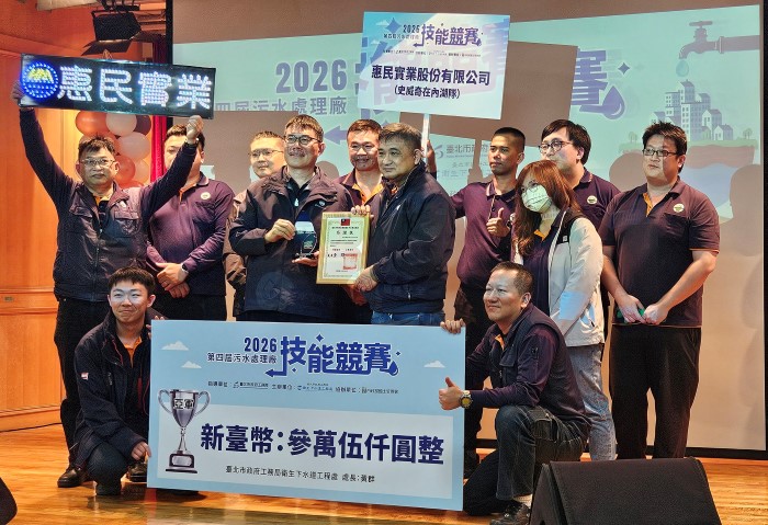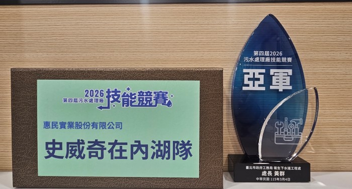 臺北市政府工務局衛生水道工程處3月4日於迪化污水處理廠舉辦「第四屆2026污水處理廠技能競賽」,邀集來自全國各地污水處理廠(水資源回收中心)組隊參賽。各參賽隊伍透過專業競技切磋實務經驗,最後惠民實業史威奇在內湖隊獲得亞軍,雖未奪冠仍展現優異實力,未來將持續精進技術,爭取更佳成績。